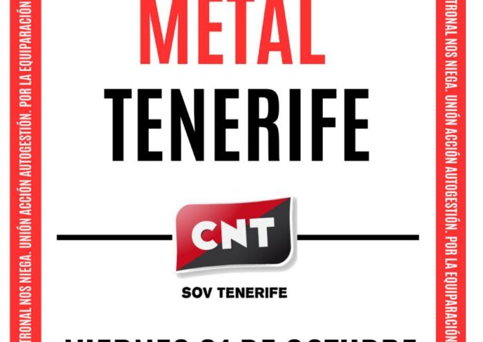 La CNT en Tenerife anima a secundar las convocatoria de Huelga en el Sector del Metal para los días 31 de octubre y 3 noviembre. A instancias de la afiliación presente en el ramo, el sindicato considera que las reivindicaciones…