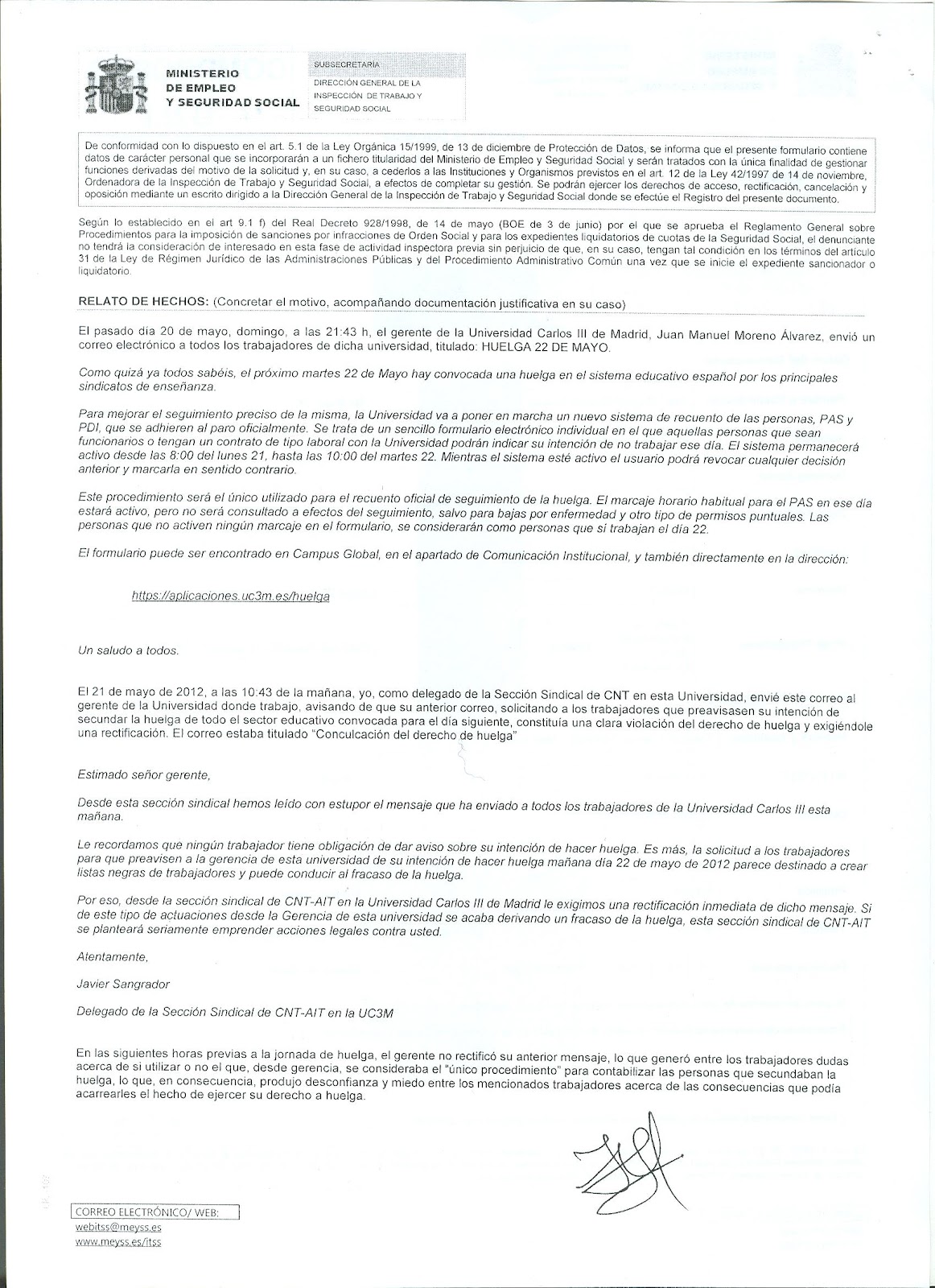 La sección sindical de CNT en la Universidad Carlos III envió inmediatamente un correo al gerente recordándole que «ningún trabajador tiene obligación de dar aviso sobre su intención de hacer huelga» y que la solicitud a los trabajadores para que preavisen violaba el derecho de huelga y estaba destinado a provocar su fracaso y a crear listas negras de trabajadores díscolos. Le exigimos una rectificación inmediata y le avisamos de que, de no hacerlo, emprenderíamos las acciones legales que considerásemos convenientes.