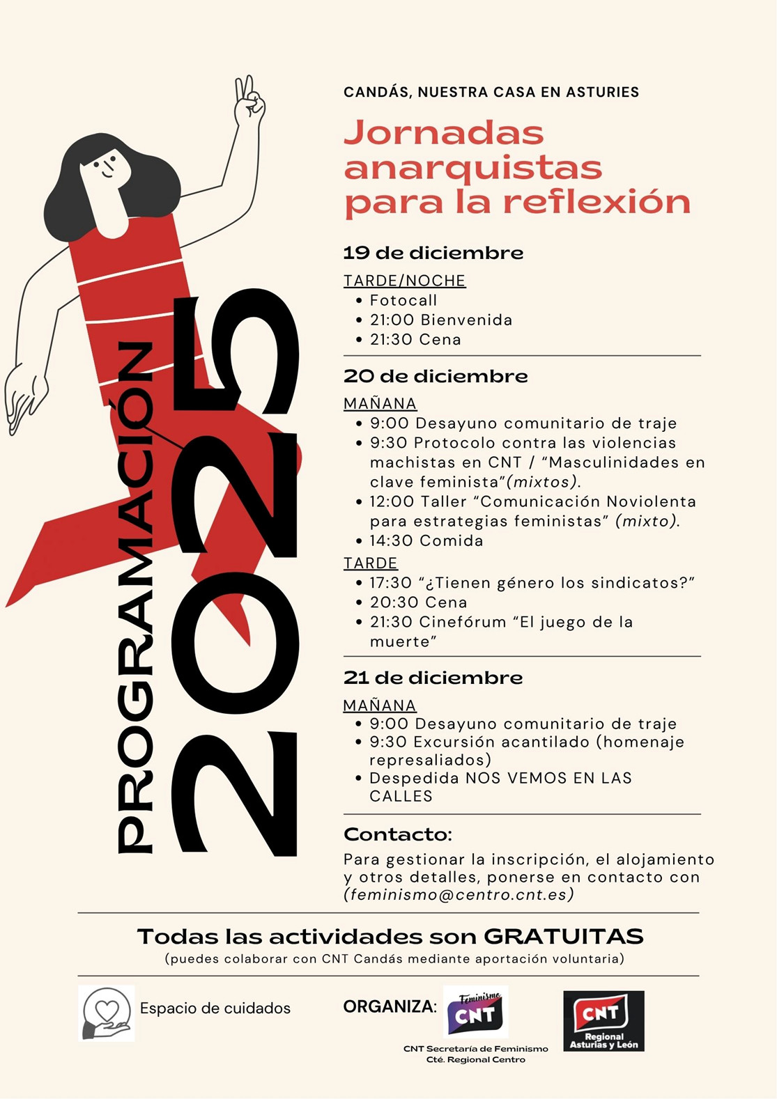 El fin de semana del 19, 20 Y 21 de diciembre, las regionales de Centro y Asturias-León organizan unas jornadas anarquistas para la reflexión y formación sobre el “Protocolo de Actuación para el abordaje de las violencias machistas en CNT”. Veremos cómo nos afectan y cómo pueden ser atajadas dentro de nuestros sindicatos, para dotarnos de herramientas prácticas y para fomentar un espacio de seguridad, confianza y reflexión conjunta.